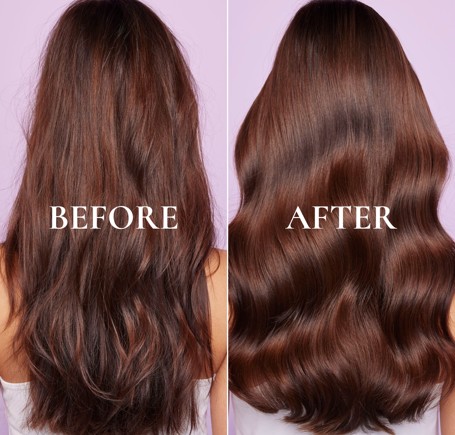 Vorher/Nachher: Ergebnisse nach Anwendung des Glanz-Shampoos, der Intensiv Reparierende Haarmaske und der Entwirrende Leave-In-Haarmilch.