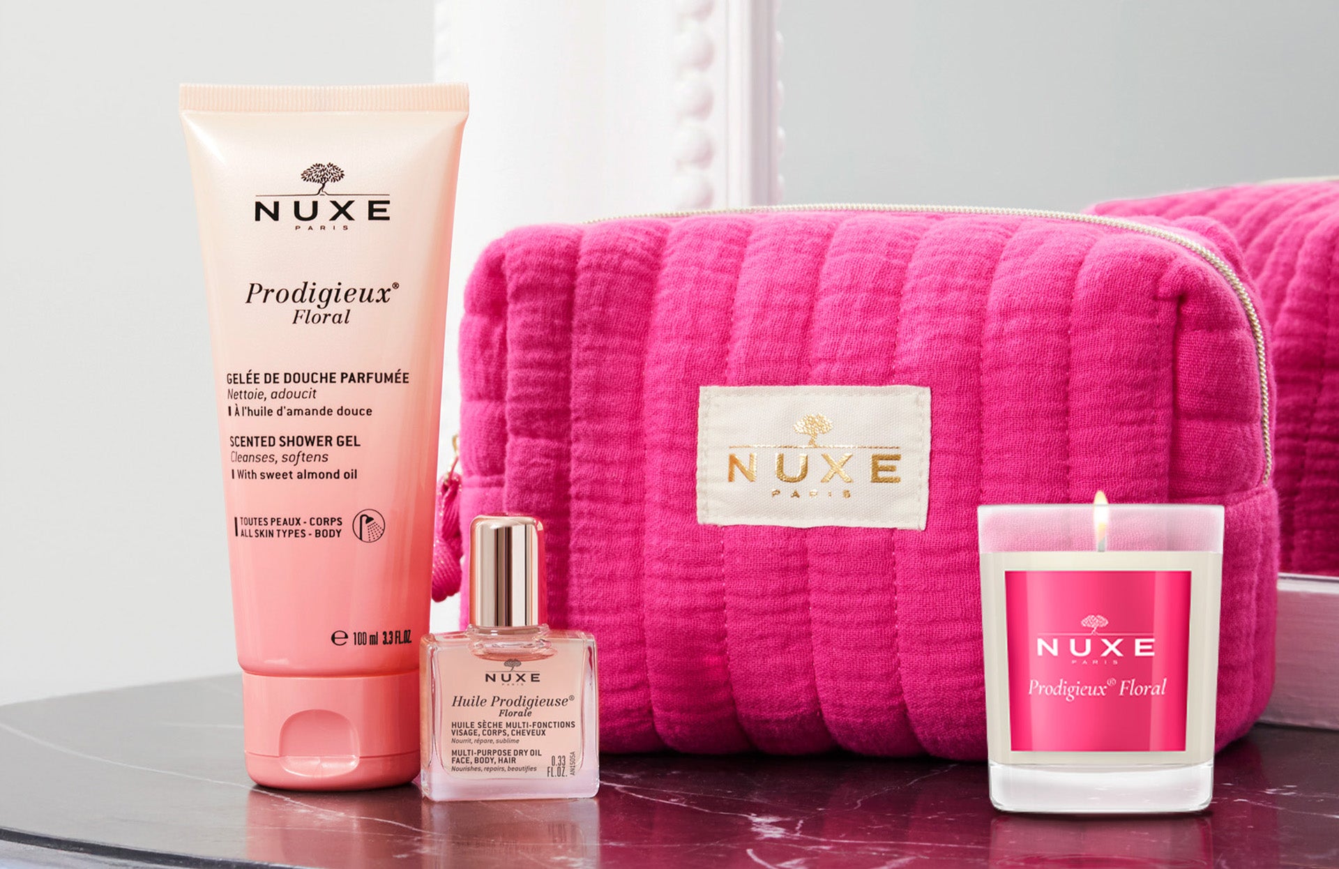 Une adorable trousse fuchsia en gaze de coton contenant 2 produits aux notes florales pétillantes offerte dès 80€. Lavez délicatement votre peau avec la Gelée de Douche parfumée (100ml) puis sublimez-la du glow satiné de L’huile Prodigieuse® Florale (10ml).