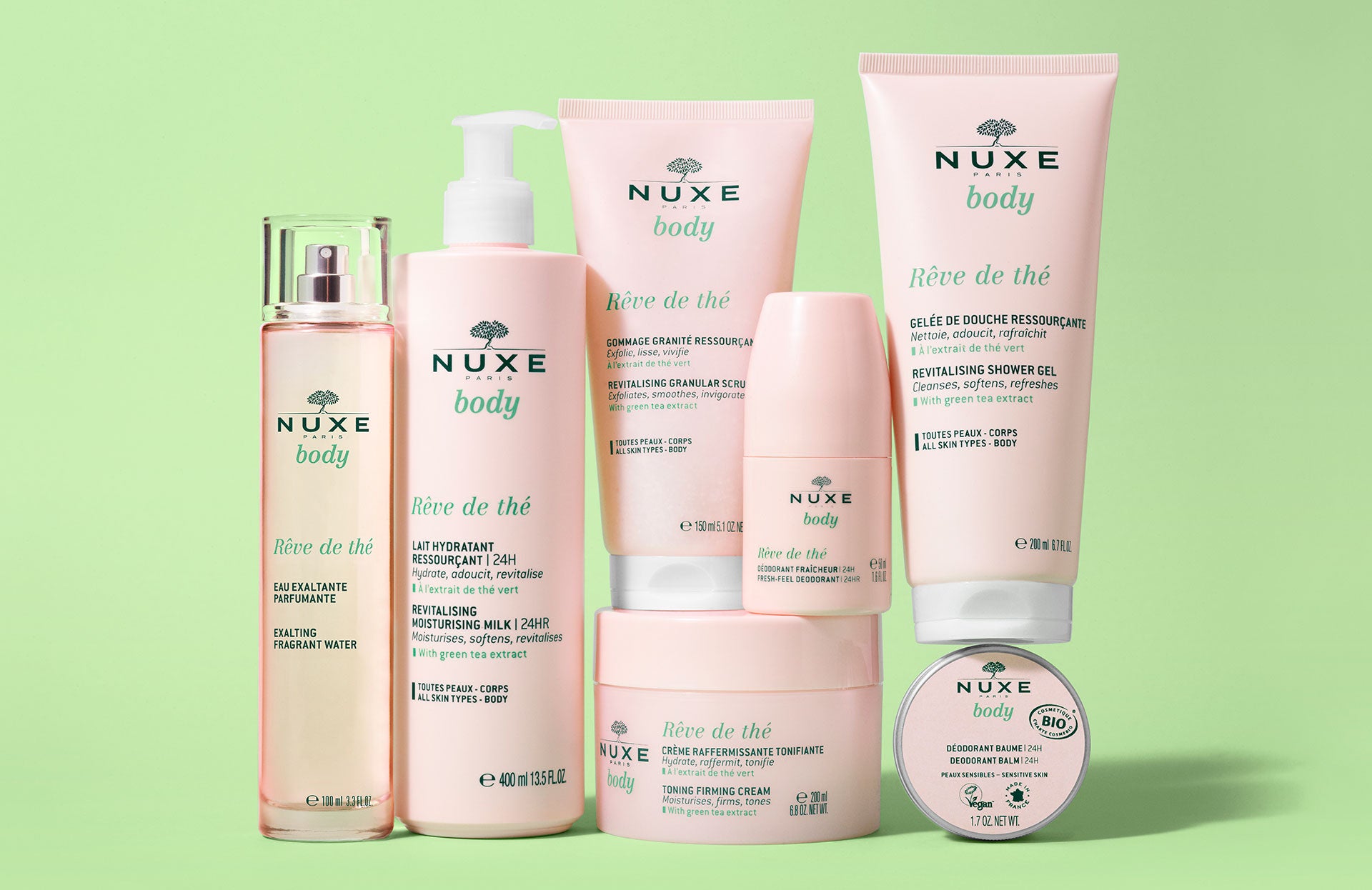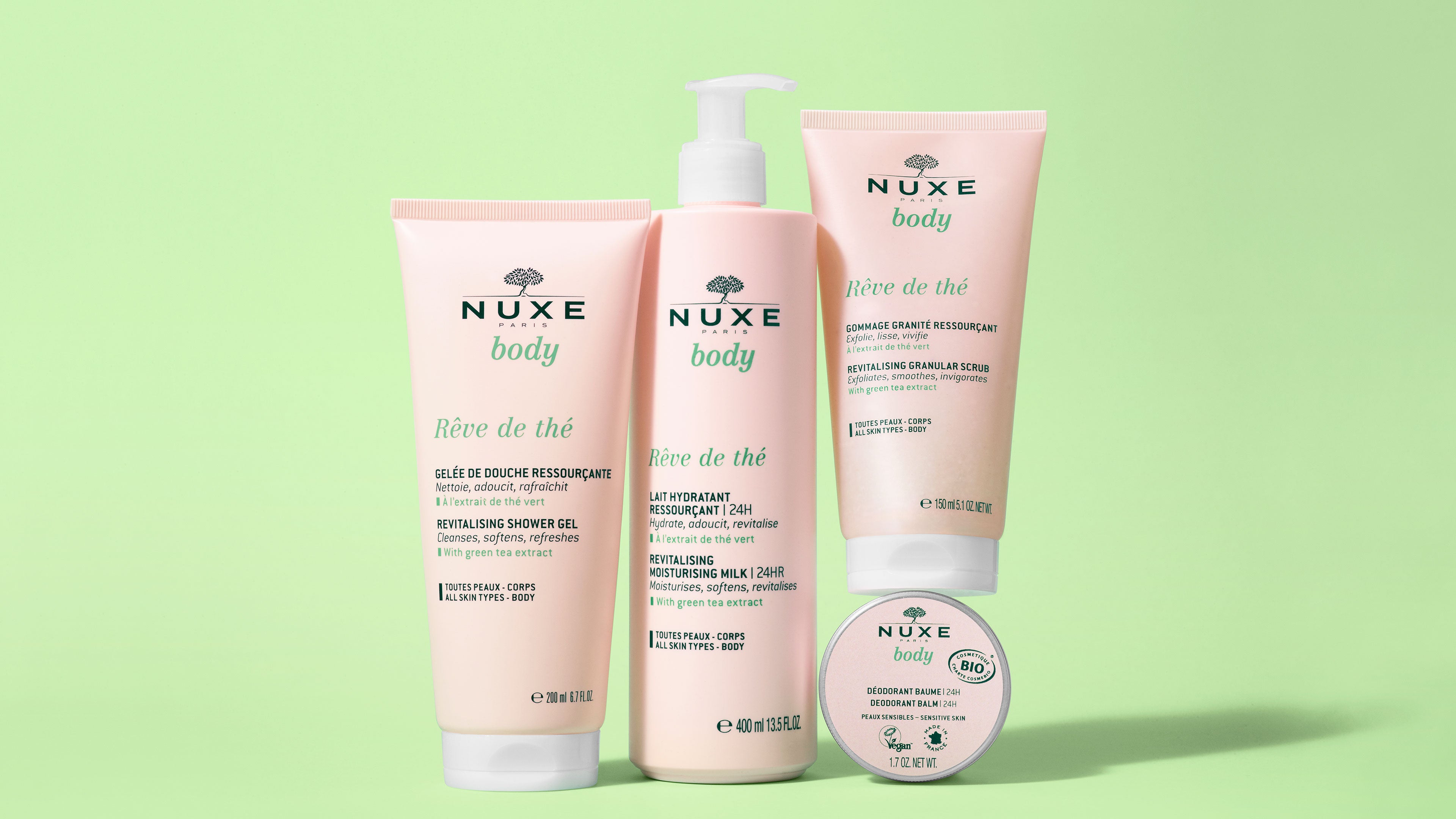 Tanken Sie Geist und Körper mit Rêve de Thé⁽¹⁾ auf, die Körperpflege-Produktlinie, die Ihnen guttut. Die intensiv sinnlichen Texturen dieses Pflegerituals sind durchtränkt mit einem Grüntee-Extrakt⁽¹⁾. jedes Produkt dieser Pflegeserie perfektioniert Ihre Haut⁽²⁾ und bietet Ihnen einen Moment im Einklang mit Ihren Sinnen. Ein Moment der Erfülltheit, zu dem auch der Duft von Rêve de Thé beiträgt: spritzige Rhabarbernoten, gemischt mit frischen Kräutern und einer Herznote aus Grüntee⁽¹⁾.