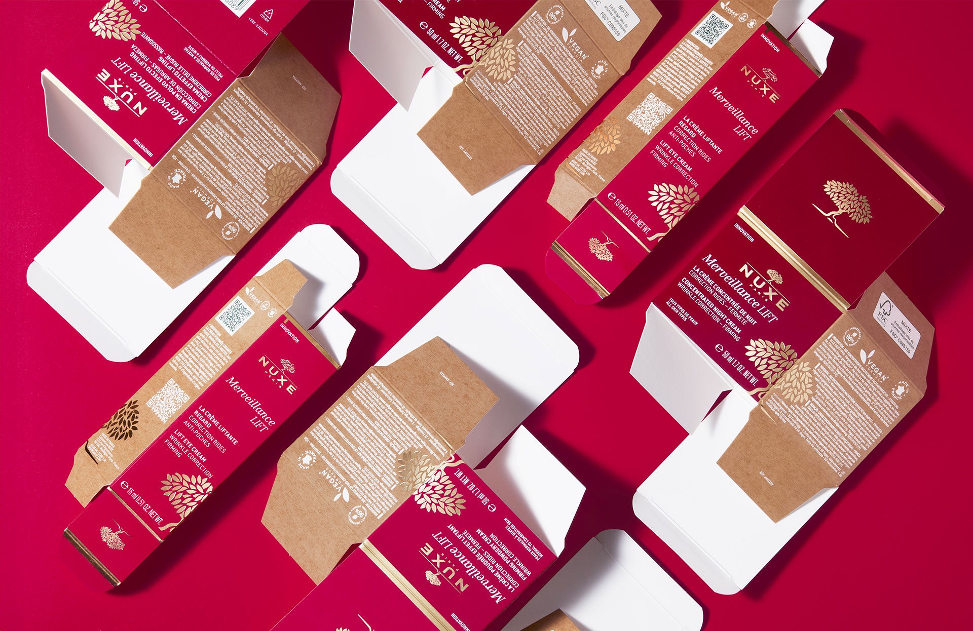 NUXE bekämpft Umverpackungen, indem es die Etuis so nah wie möglich an die Behälter der Gesichtscremes anpasst, um Verschwendung zu vermeiden.