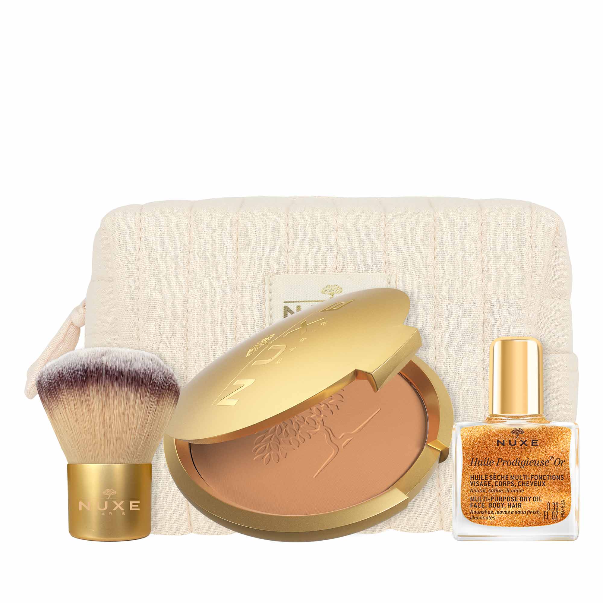 Ein strahlendes Duo für einen leuchtenden Teint und verschönte Haut, zusammen mit einem Kabuki-Pinsel in einer eleganten Kosmetiktasche.