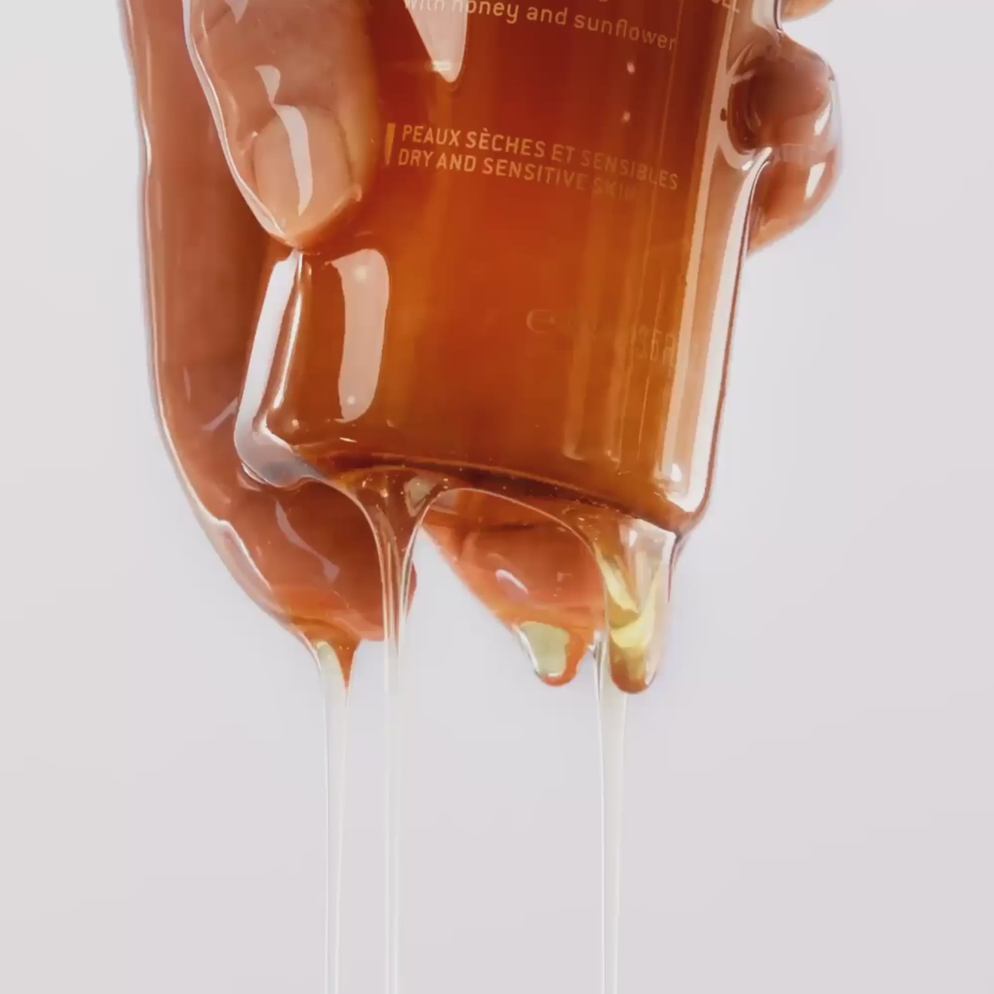Dieses rückfettende Reinigungsgel für Gesicht und Körper mit Honig und Sonnenblume ist reichhaltig und hat einen verführerischen Honigduft.